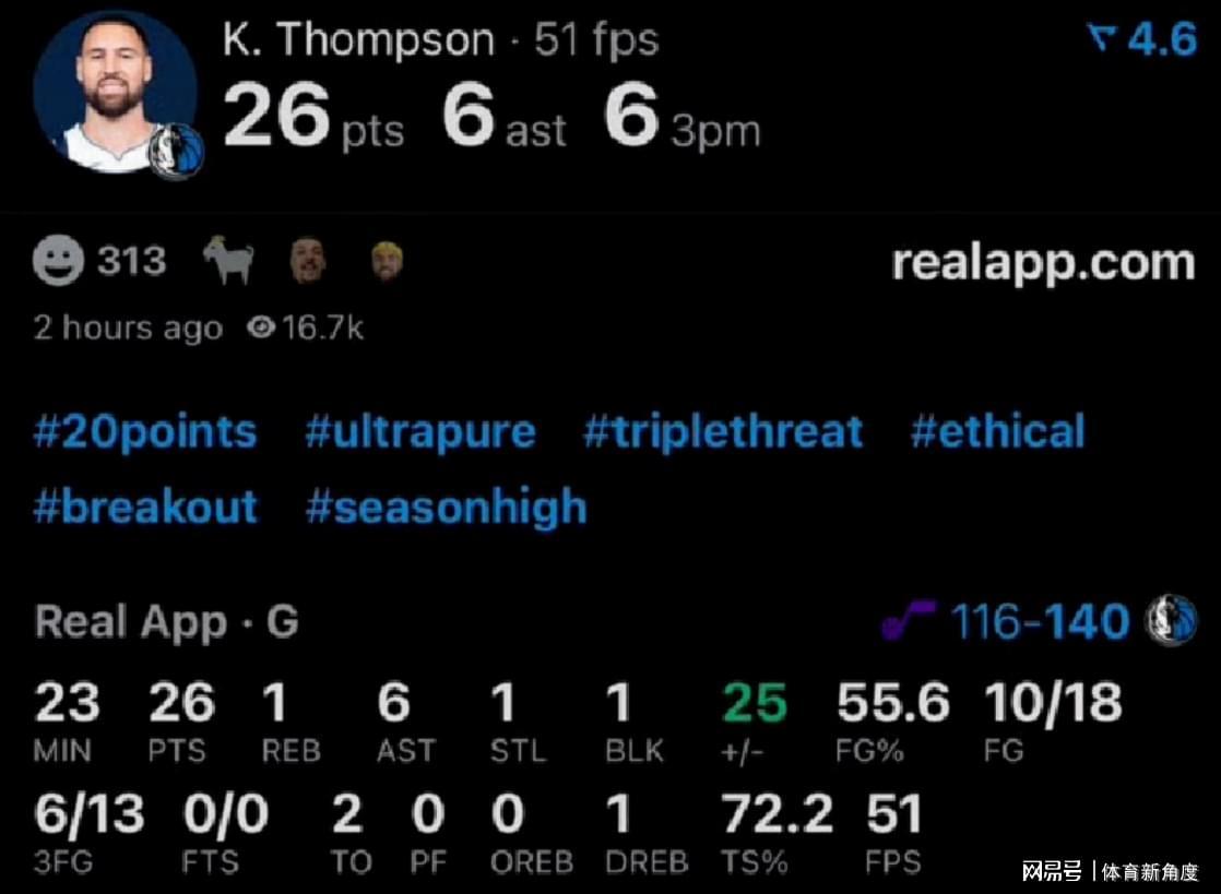 汤普森这场创造里程碑的比赛,那可真是精彩绝伦!在独行侠144 - 122大胜爵士的这场“大战”里,投篮18次,有10次稳稳命中,三分球更是厉害,13次出手,6次精准入网,轻轻松松就砍下26分,还顺便送出6次助攻,把队友们也喂得饱饱的,厉害吧!